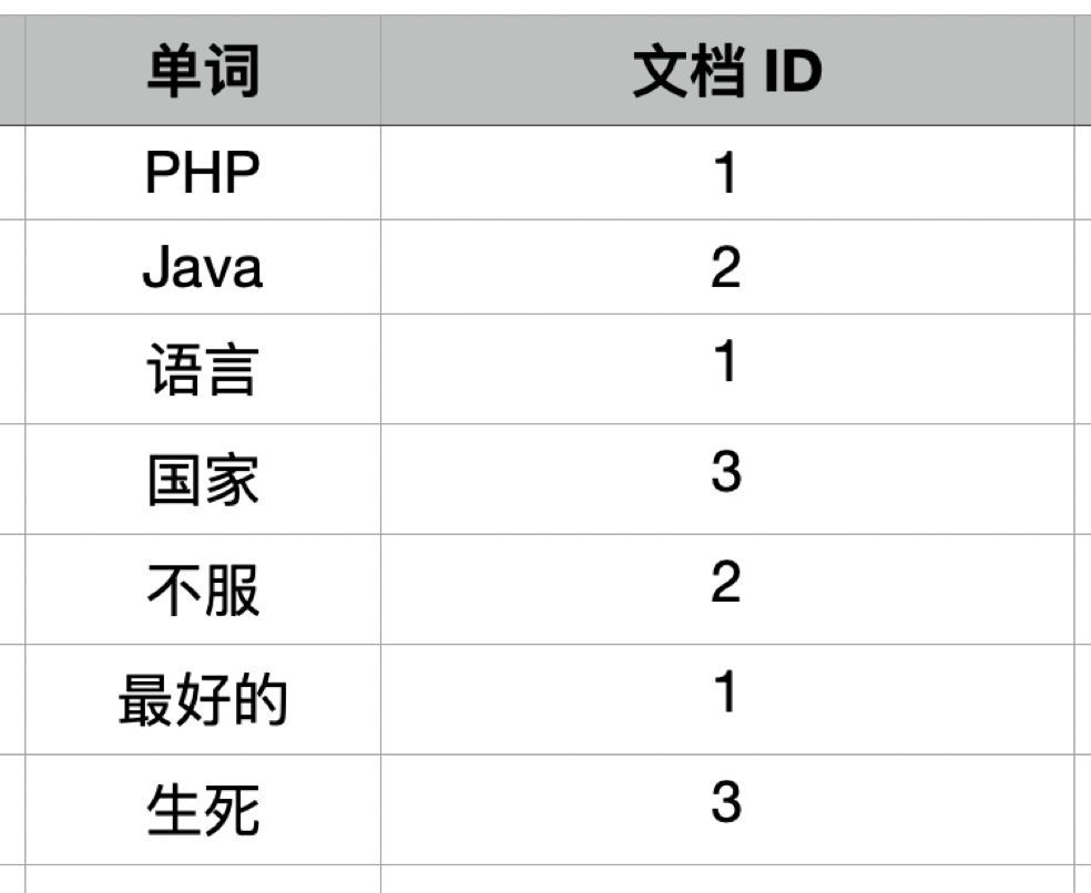 倒排索引相当于书的索引,是内容到文档 ID 的映射。
