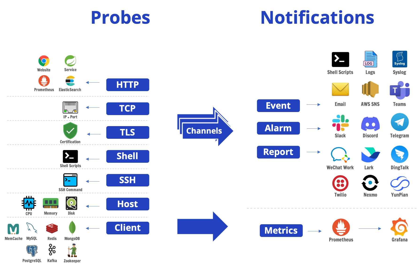 基础探活:采用心跳机制,定期检查某个服务的连通性,让心跳检查失败时,触发告警。MegaEase 开源了 EaseProbe 可以作为众多服务的探活工具。