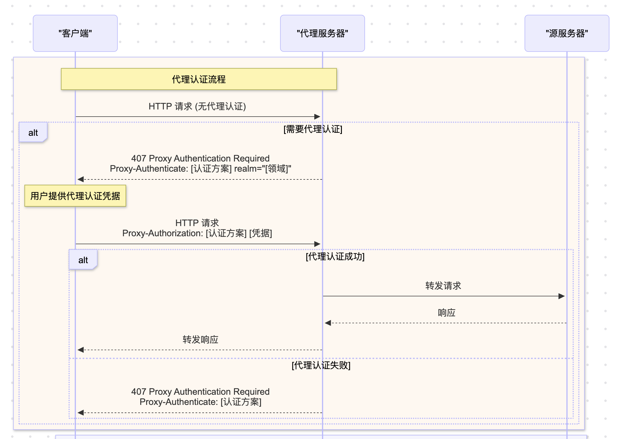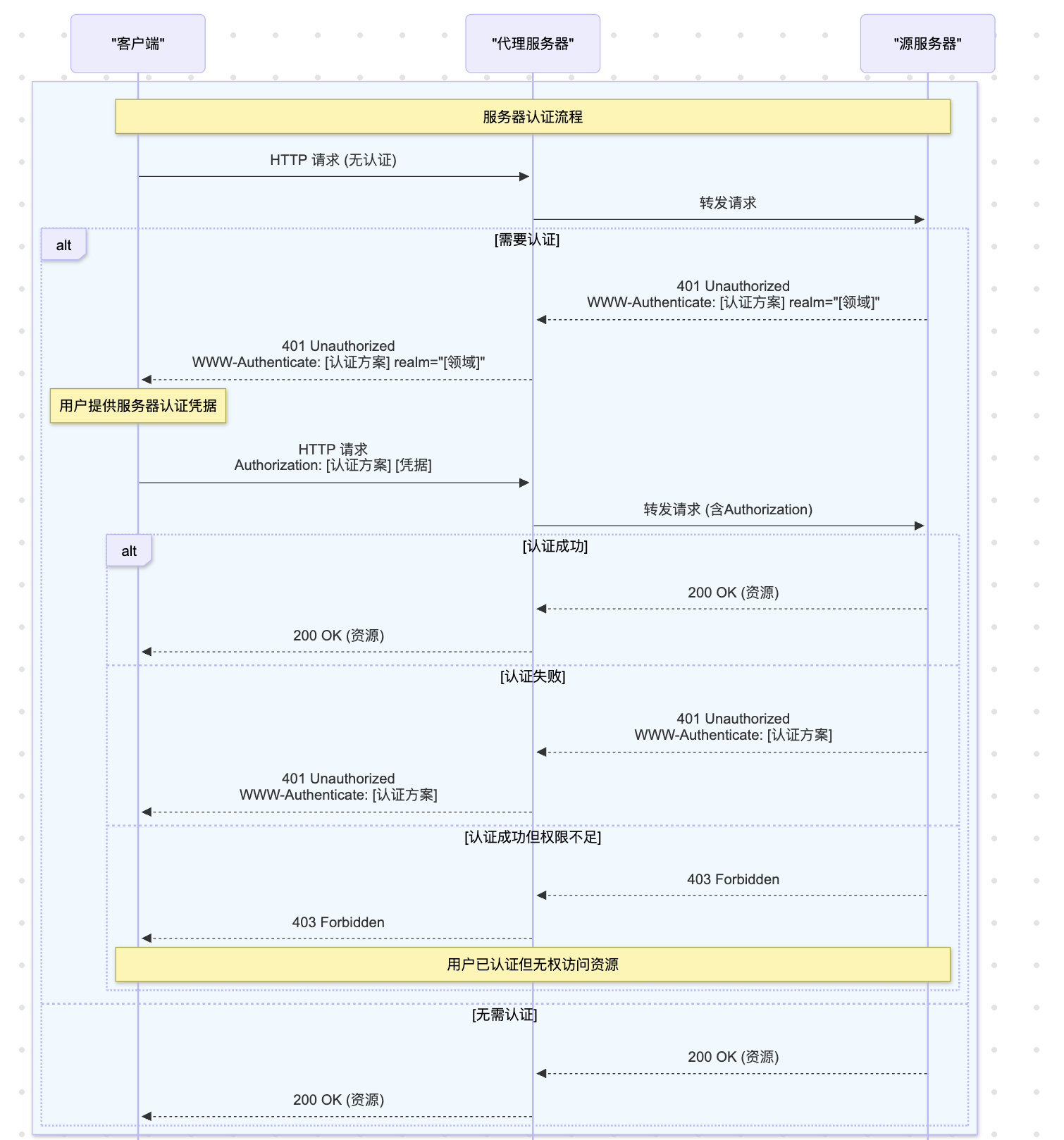 RFC 7235 中定义了 HTTP 协议的认证框架,要求在支持 HTTP 协议的服务器,如果访问服务的身份验证失败,需要返回 401 Unauthorized 或 407 Proxy Authentication Required 状态码,并告知客户端应该采用何种方案提供凭证信息,收到响应后客户端按要求加入认证凭据信息后才能继续访问。