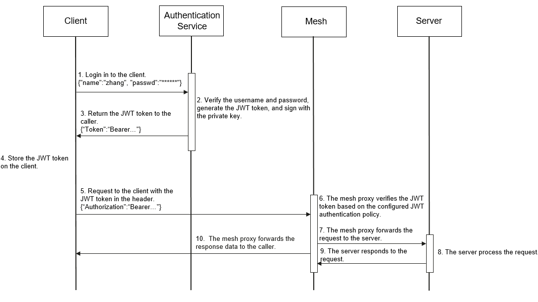 在认证授权方面,用户身份和权限管理依然属于应用业务逻辑的一部分,需要微服务自身来实现,但后续的校验流程可以交给服务网格实现,比如通过使用 JWT 作为令牌时,可以将公钥放置在 SideCar 中,请求在进入应用之前在 SideCar 就可以实现,Istio 就采用了这种方式,流程如下图所示。对于授权,则可以通过 SideCar 与授权服务器交互的方式完成权限校验,但通常情况下,细粒度的权限校验通常还是交由服务来实现。