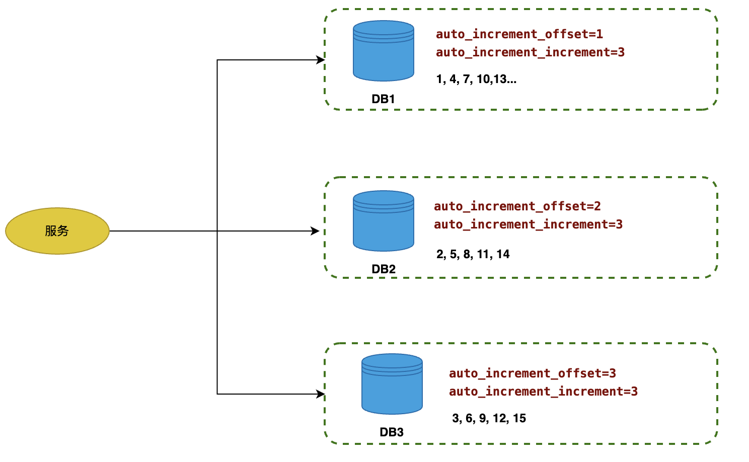 比如当通过分库分表拆分为三个数据库时,可以设置如下起始值和步长来实现全局自增 ID 唯一: