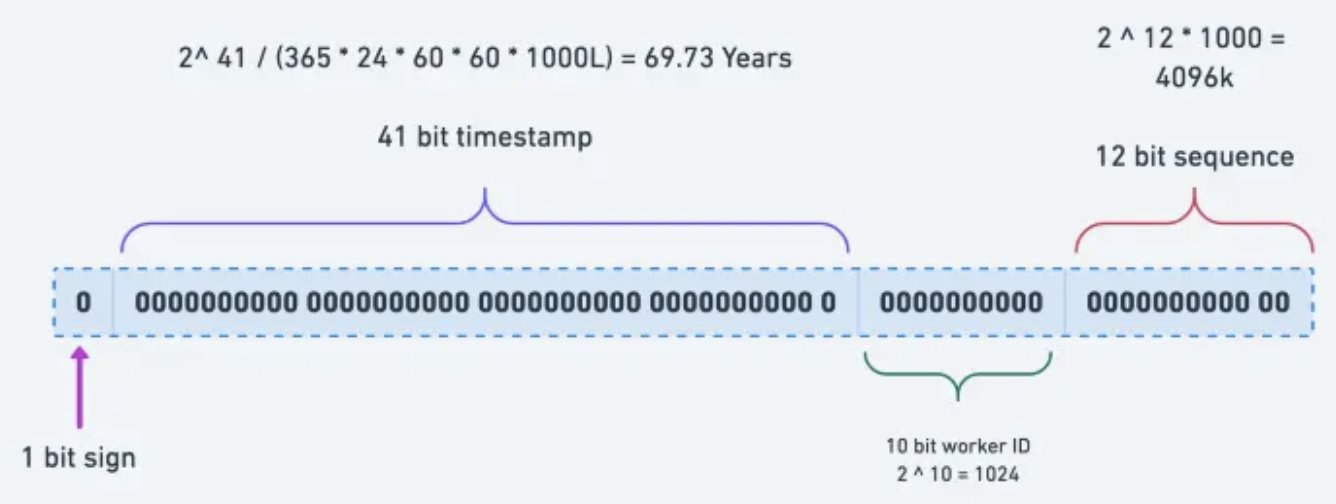 - 41 位时间毫秒时间戳,其可用年限大约为 69 年。
